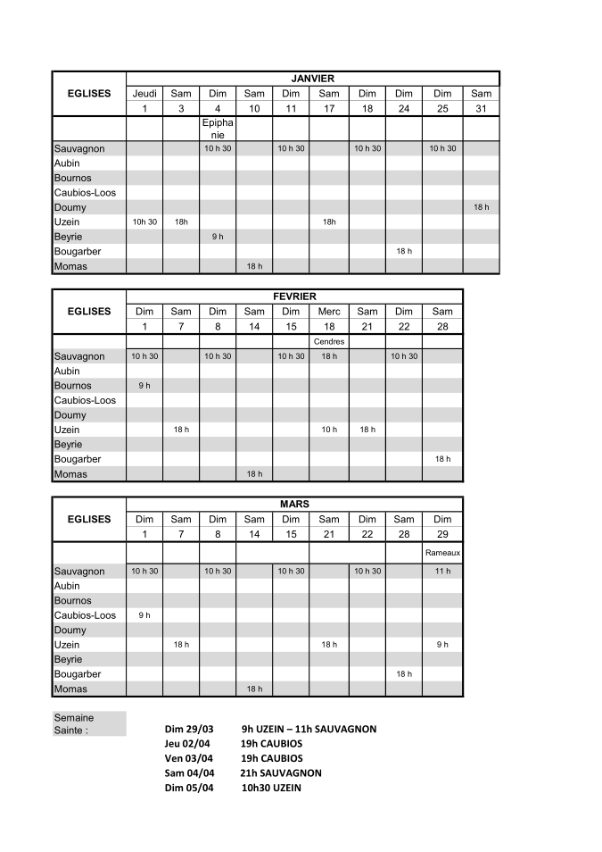 Planning trimestriel des messes